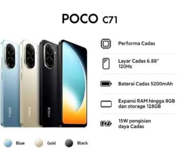 POCO C71 telah resmi diluncurkan di Indonesia pada 15 Mei 2025 sebagai smartphone entry-level paling terjangkau dari lini POCO dengan harga promo awal hanya Rp 999.000 untuk periode terbatas hingga 25 Mei 2025, kemudian menjadi Rp 1.099.000 untuk harga normal, menjadikannya pilihan sangat menarik bagi pelajar, mahasiswa, atau pengguna pertama smartphone yang menginginkan perangkat dengan fitur lengkap namun budget sangat terbatas. Dengan menggunakan chipset UNISOC T7250 yang diklaim memiliki performa setara dengan MediaTek Helio G81, POCO C71 hadir sebagai rebrand dari Redmi A5 dengan perbedaan utama pada desain dual-tone di panel belakang yang lebih stylish serta pilihan warna yang lebih berani yaitu Black, Blue, dan Gold. Keunggulan utama POCO C71 terletak pada layar IPS LCD berukuran jumbo 6,88 inci dengan refresh rate 120Hz yang sangat jarang ditemukan di segmen harga sejutaan memberikan pengalaman scrolling sangat smooth, kamera utama 32 megapiksel dengan mode malam yang menghasilkan foto cukup detail untuk media sosial, serta baterai berkapasitas 5.200 mAh yang diklaim mampu bertahan hingga 20 jam untuk pemutaran video atau seharian penuh untuk penggunaan normal. Meski hanya smartphone entry-level, POCO C71 tidak mengorbankan fitur penting seperti sensor sidik jari yang terintegrasi di tombol power untuk keamanan ekstra, jack audio 3,5mm yang masih tersedia untuk pengguna earphone kabel, serta slot microSD dedicated hingga 1TB yang memungkinkan pengguna menyimpan banyak file tanpa perlu khawatir kehabisan ruang penyimpanan.