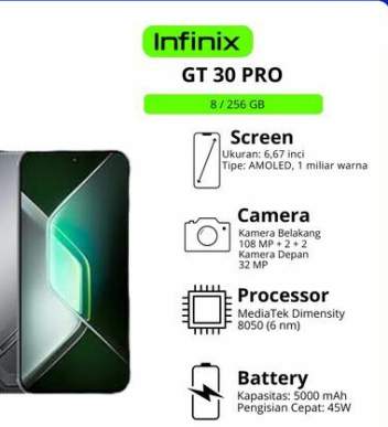 Infinix GT 30 Pro termasuk HP kelas apa? Dari segi harga dan spesifikasi, ponsel ini masuk kategori menengah atas (mid-to-high range). Dengan harga mulai Rp 3.7 jutaan, ponsel ini berada di bawah flagship murni (yang harganya di atas Rp 7 juta), namun jauh lebih kuat dari ponsel kelas menengah biasa. Posisinya tepat untuk gamer yang serius tapi tidak ingin menghabiskan uang sebanyak membeli iPhone atau Samsung Galaxy S series.
